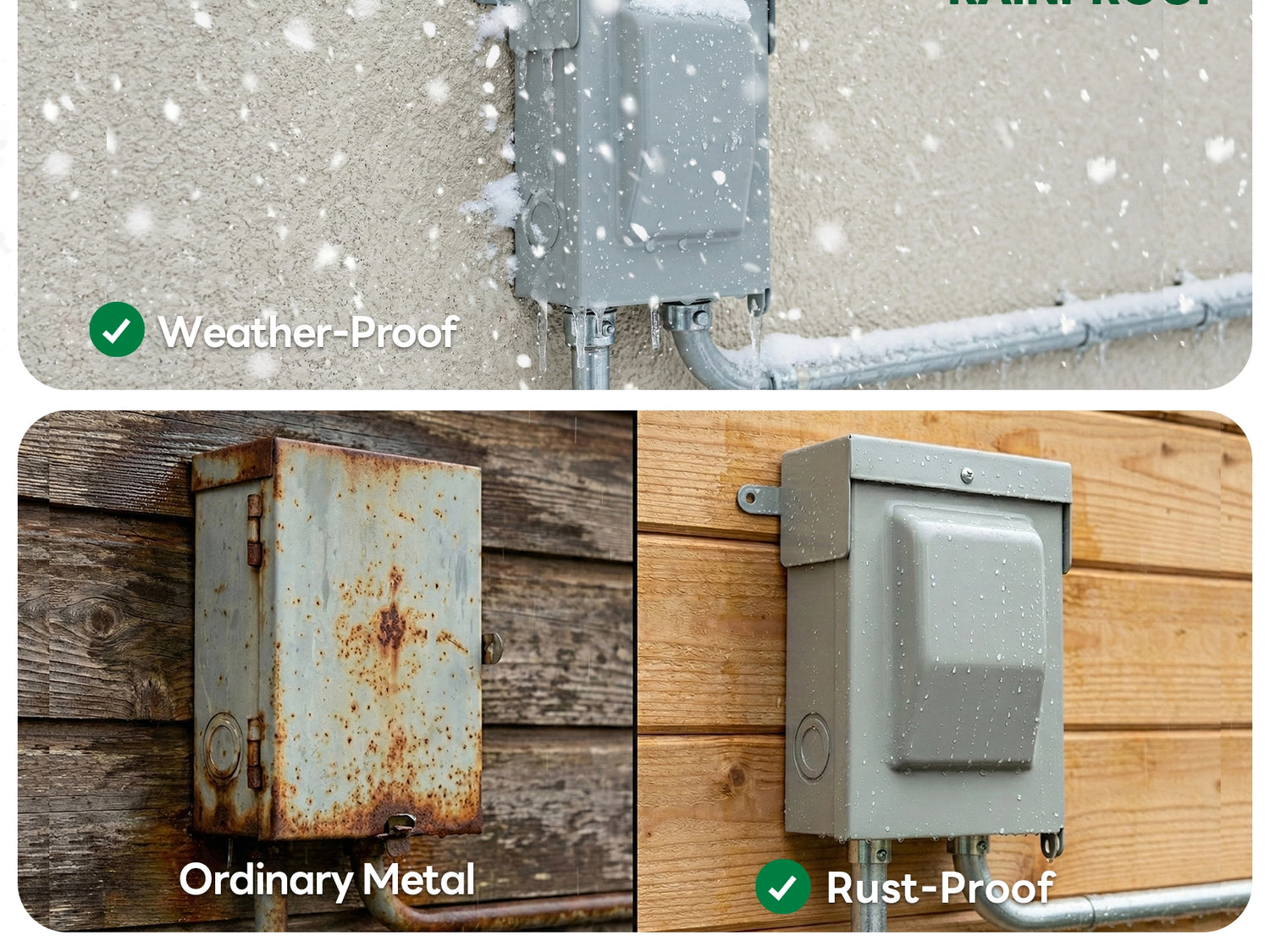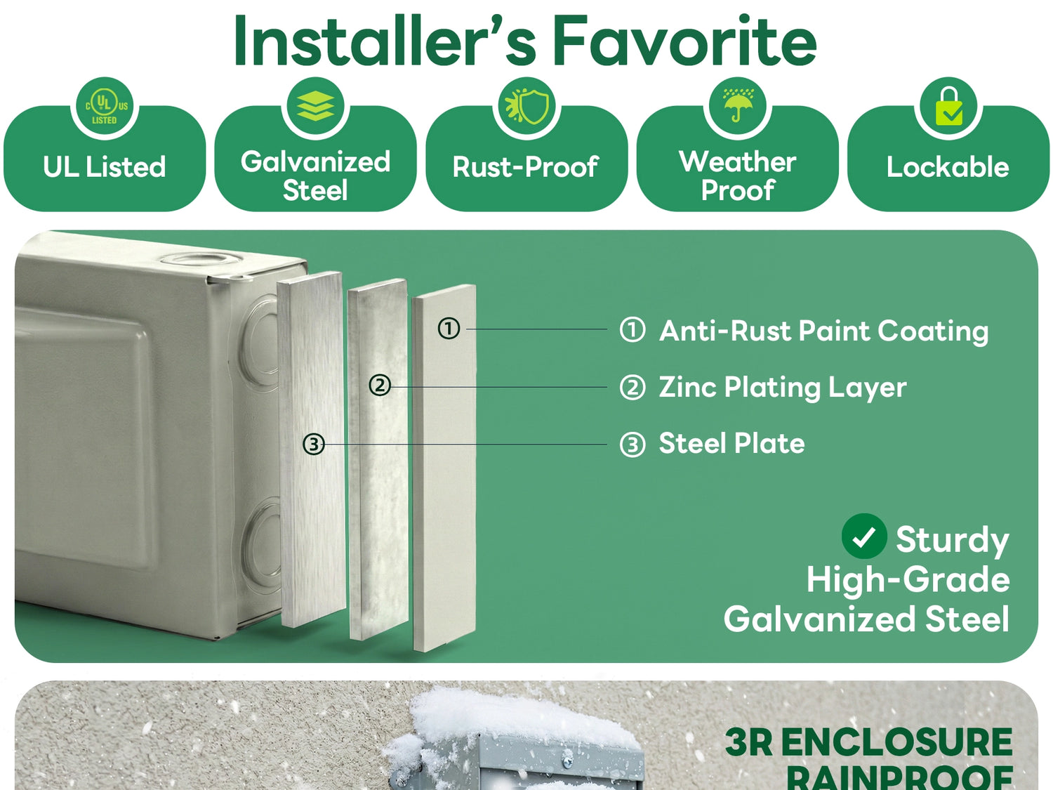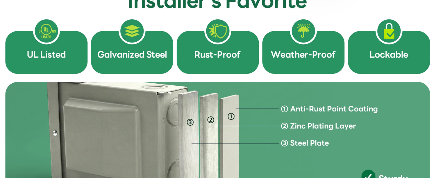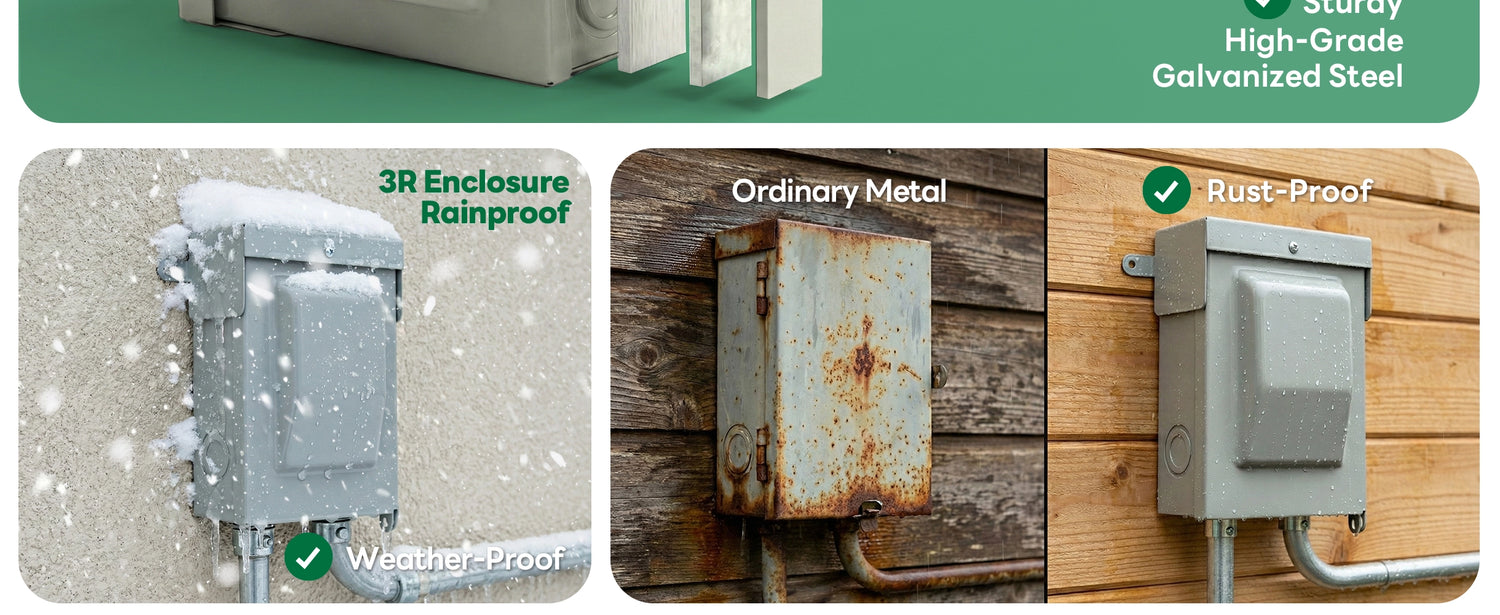✔ Weatherproof Outdoor Steel Enclosure: Powder-coated steel with NEMA 3R rating protects against rain, dust, and harsh environmental conditions. Lockable lift-up cover provides extra security