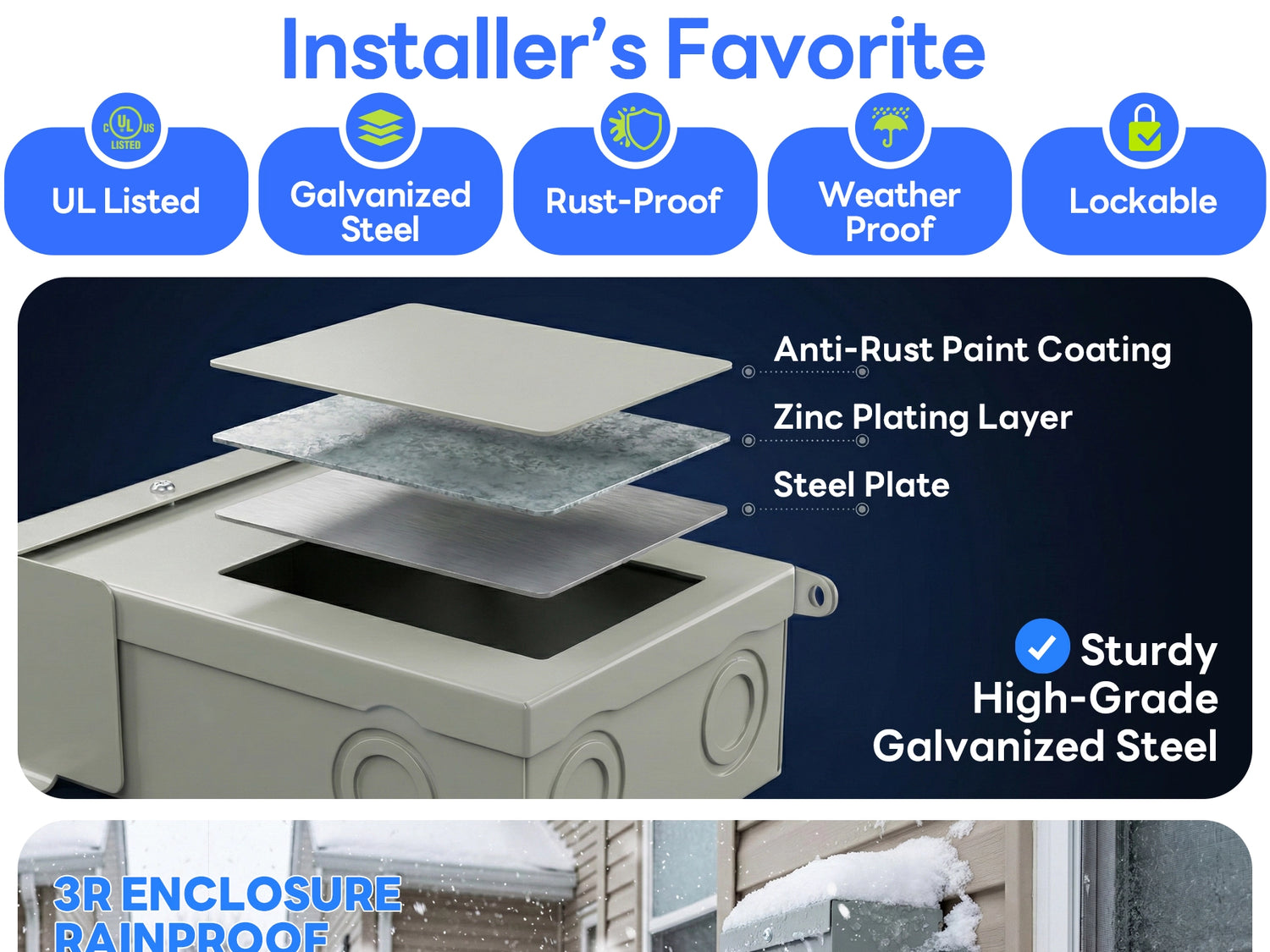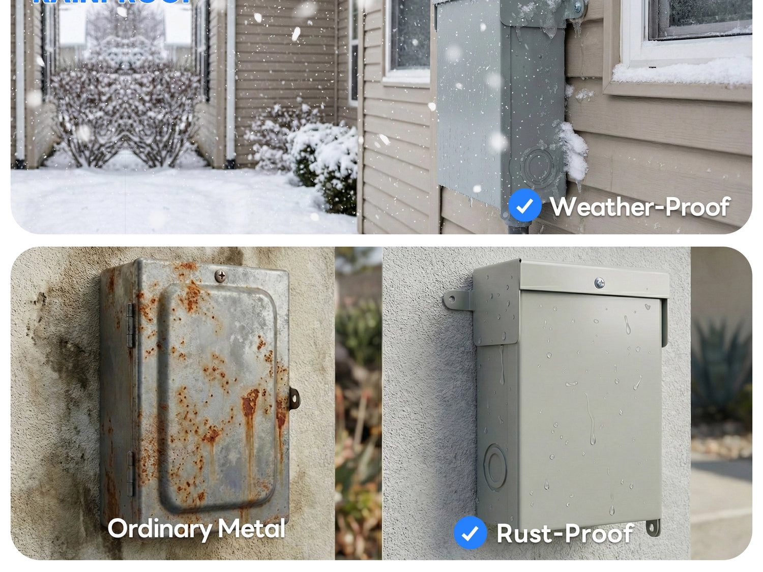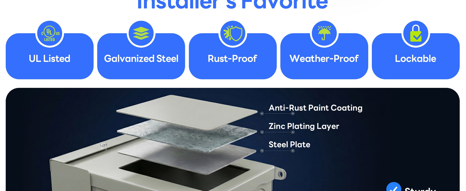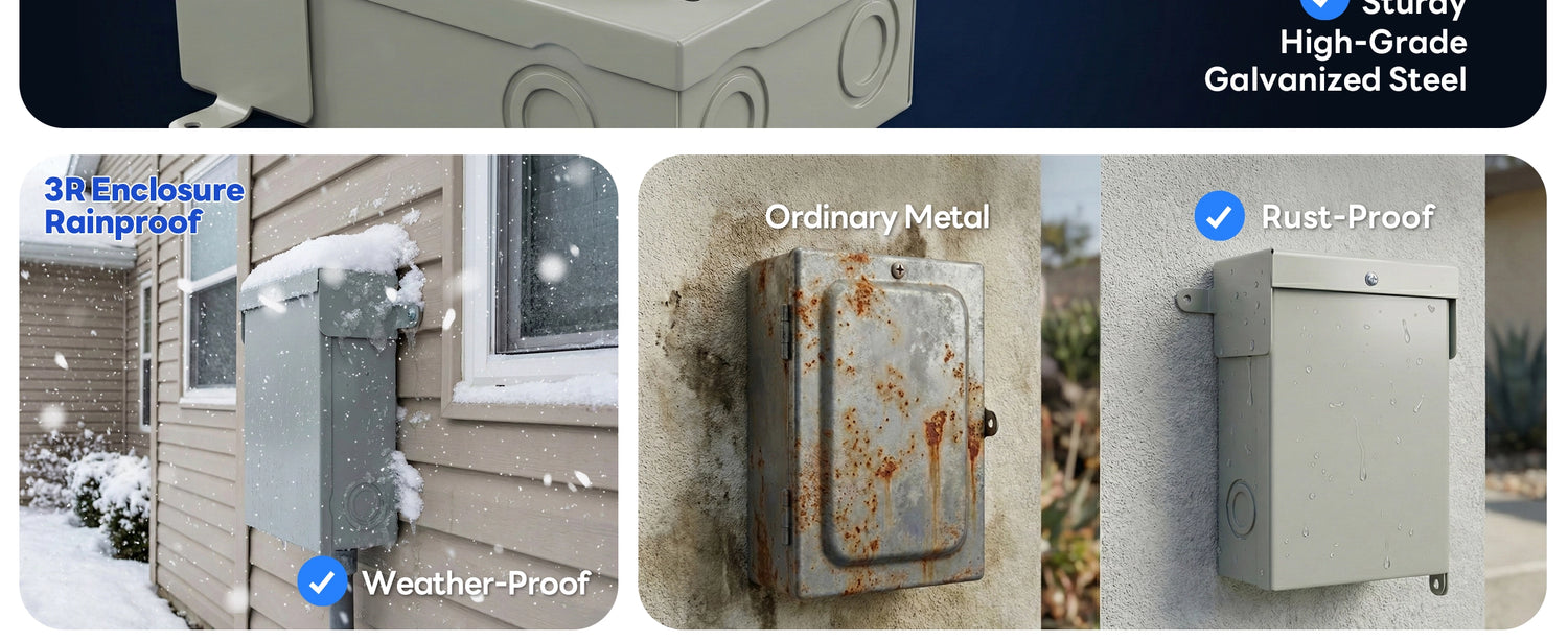 ✔ Weatherproof Outdoor Steel Enclosure: Durable powder-coated steel housing with NEMA 3R rating resists rain, dust, and outdoor elements. Lift-up cover with lockable latch enhances safety