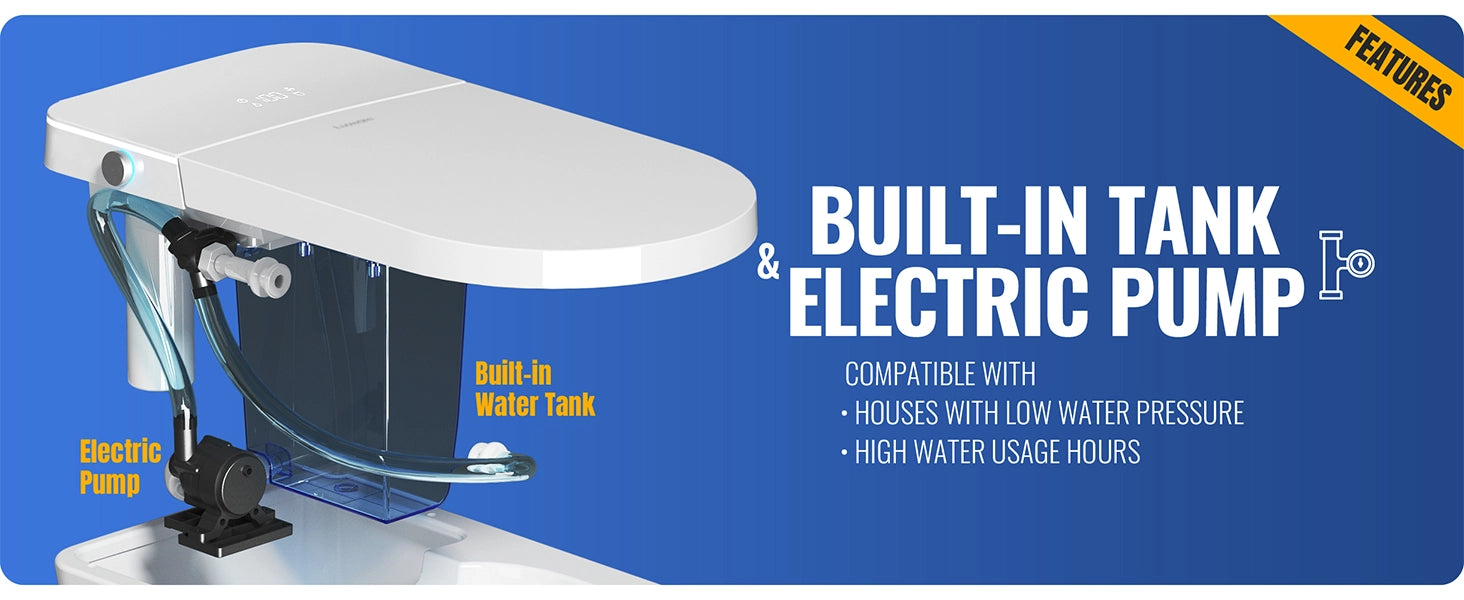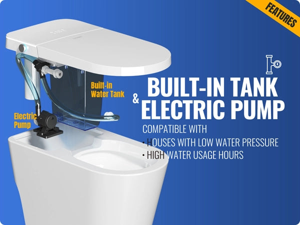 BUILT-IN TANK & ELECTRIC PUMP: Featuring a hidden tank and electric pump, this smart toilet delivers a powerful 1.03 GPF flush. Ideal for low water pressure, its siphon jet technology ensures efficient and quiet performance.