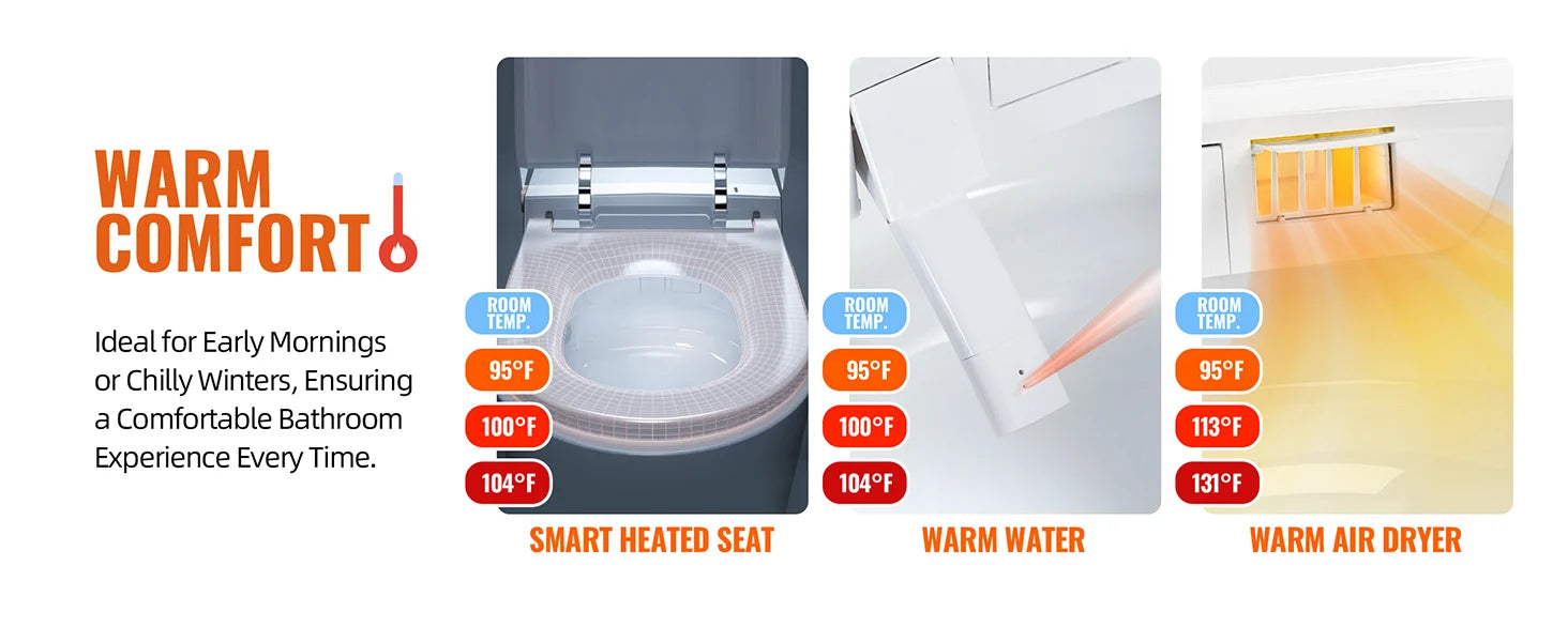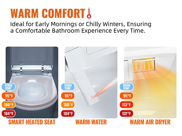 WARMING & COMFORT: Enjoy unmatched comfort with our bidet toilet, designed with a smart heated seat, an integrated bidet offering instant warm water with adjustable temperature and pressure, and a warm air dryer with customizable temperature settings. Perfect for chilly mornings or cold winters, it ensures a cozy and enjoyable bathroom experience every time.