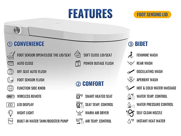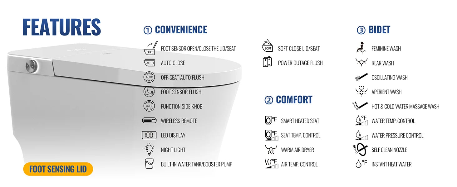 HANDS-FREE OPERATION: The LW-S02 Smart Toilet offers a completely hands-free experience. It includes an auto-close lid and seat, an auto-flush function triggered when you stand up, and a foot sensor for opening, closing, and flushing. For added convenience, all features can also be controlled using a remote or a knob.
